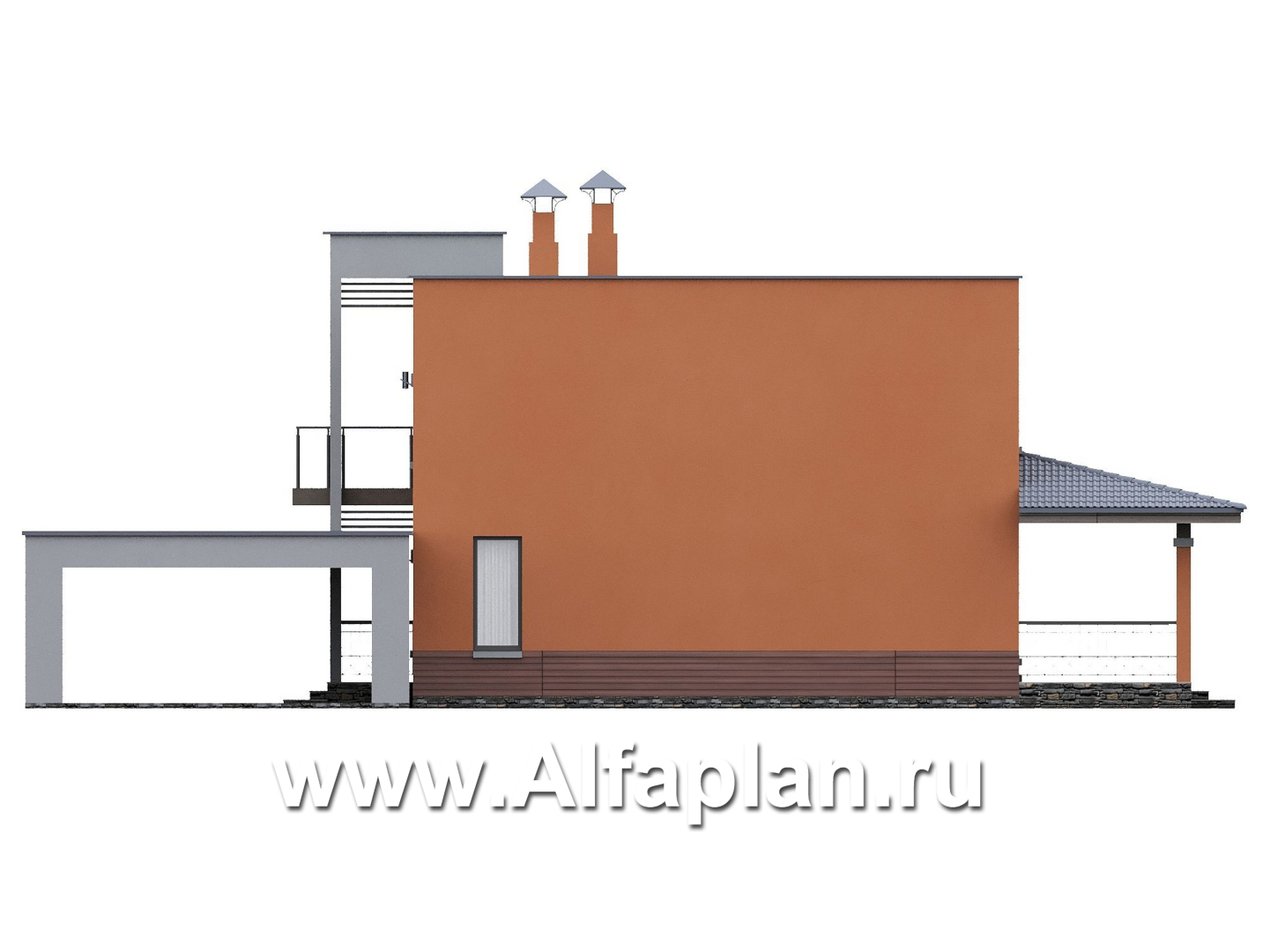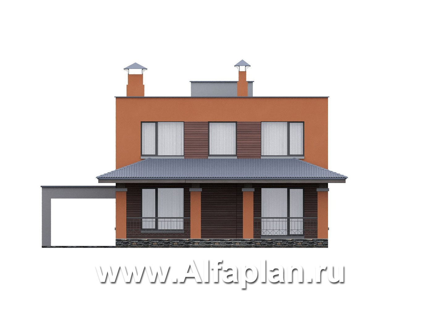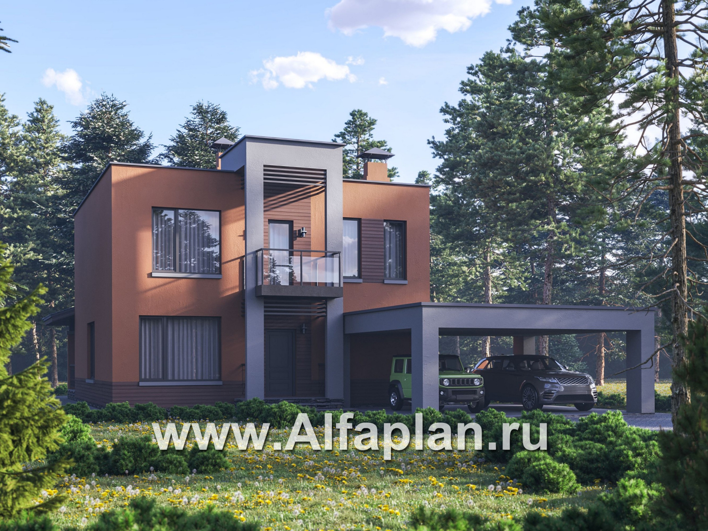 757E «Невада» - проект двухэтажного дома из газобетона, с террасой, навес на 2 авто, с плоской крышей в стиле минимализм