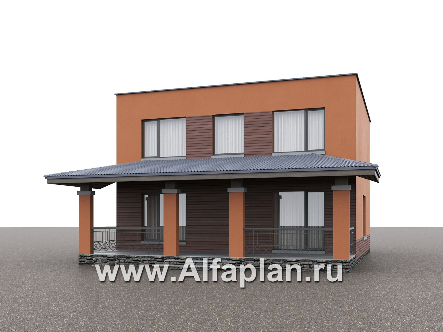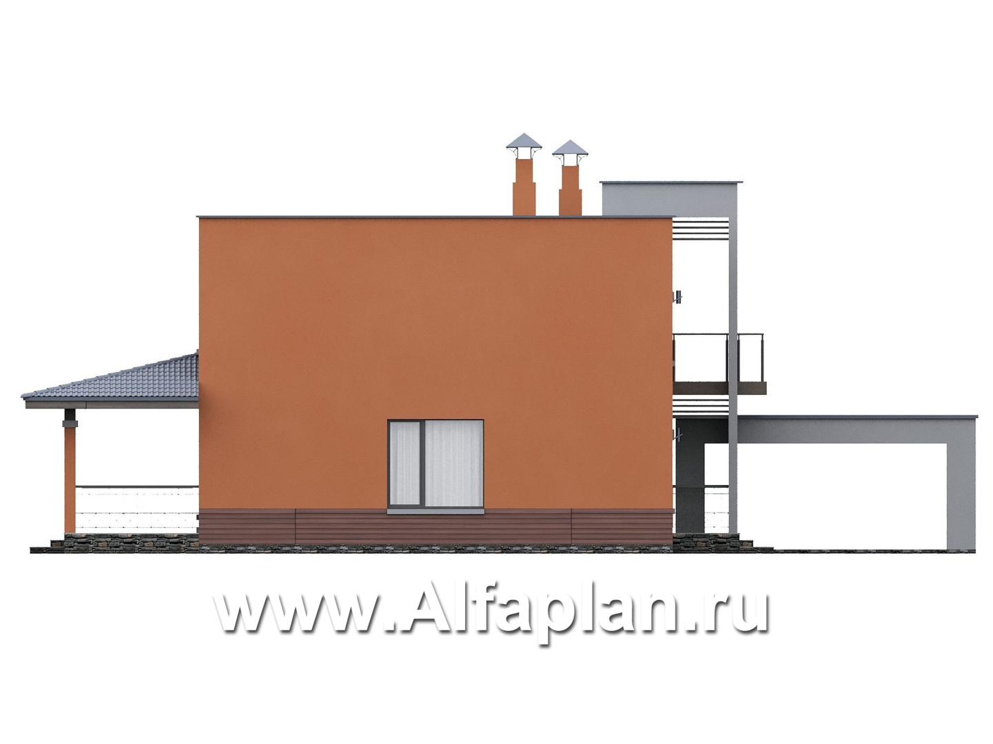 «Невада» - проект двухэтажного дома из газобетона, с террасой, навес на 2 авто, с плоской крышей в стиле минимализм
