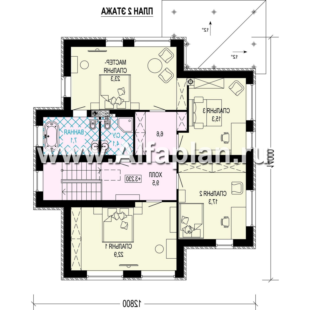 На 2 этаже по плану — три просторные спальни и кабинет хозяина. Все помещения прекрасно освещены естественным светом благодаря обилию высоких витражных окон. Широкая ванная комната с джакузи и санузел локализованы по центру строения, что делает пользование ими доступным для всех домочадцев.