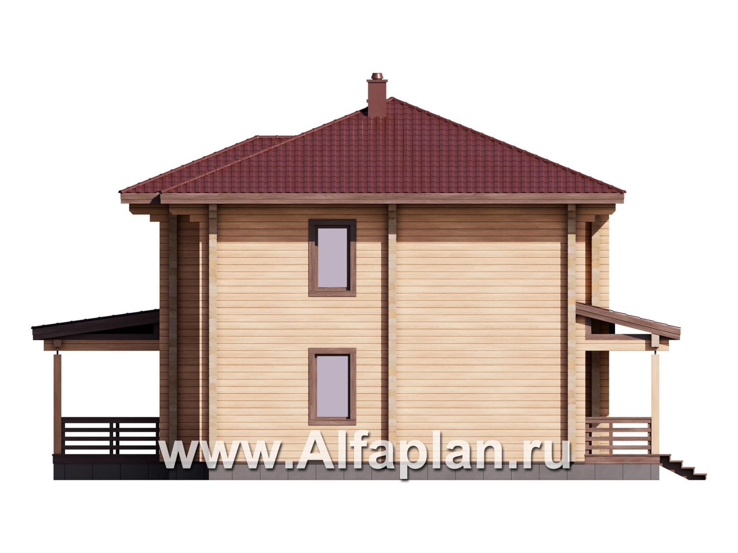 Проект двухэтажного дома из клееного бруса, планировка со спальней на 1 эт, с террасой