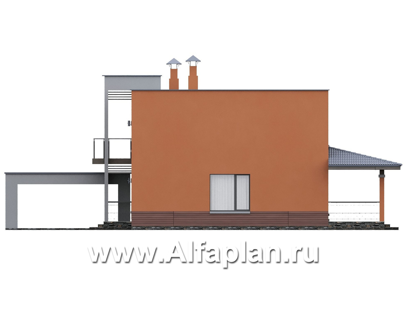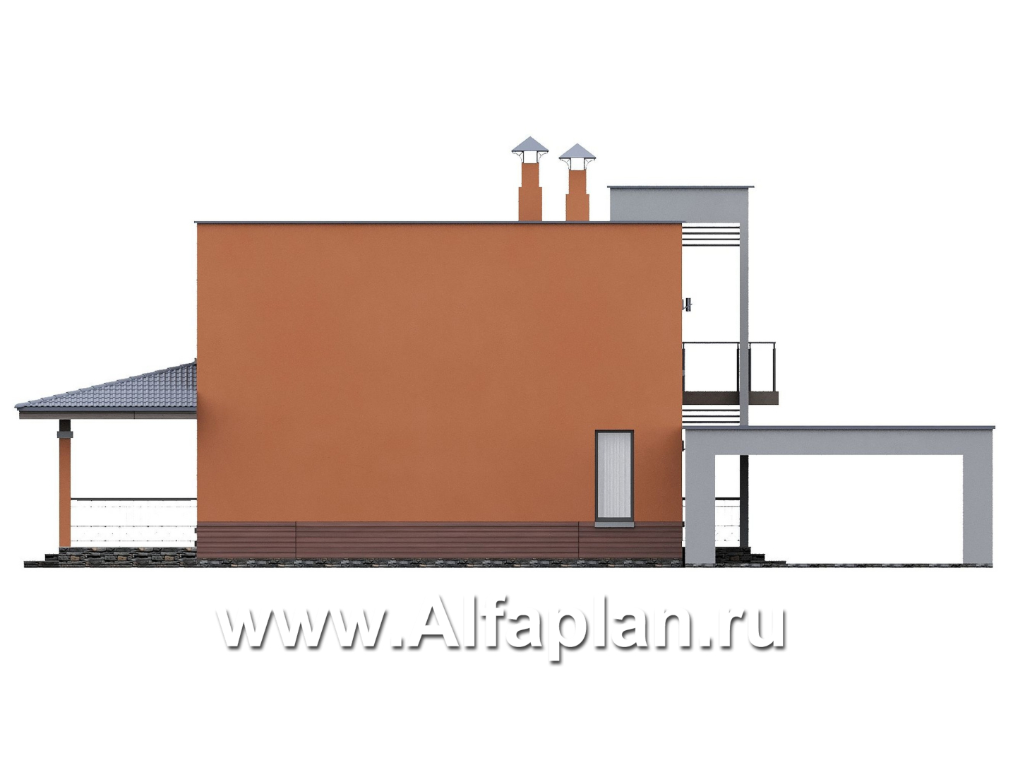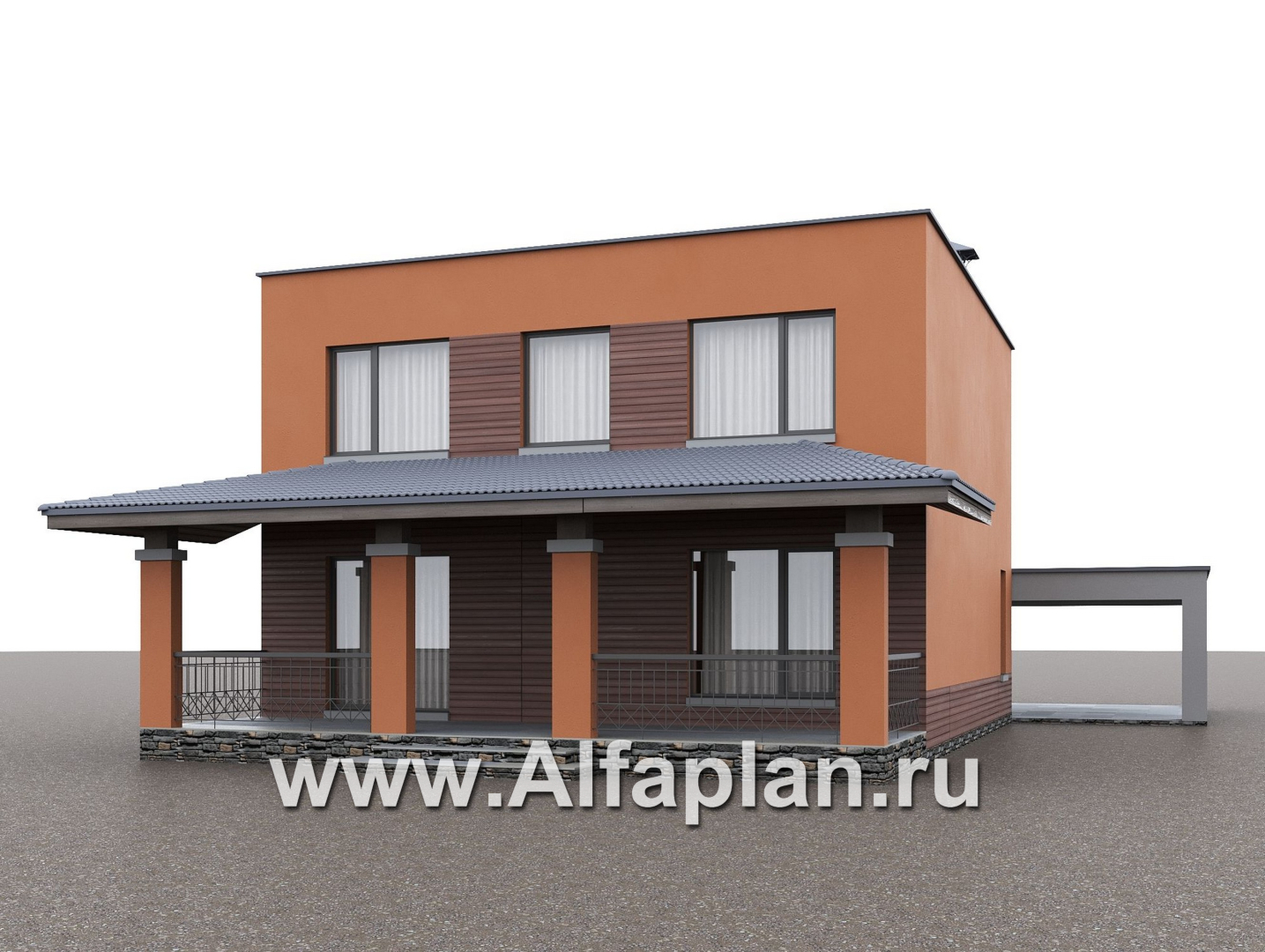 «Невада» - проект двухэтажного дома из газобетона, с террасой, навес на 2 авто, с плоской крышей в стиле минимализм