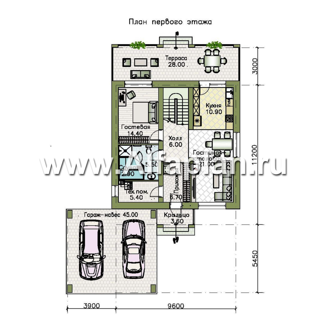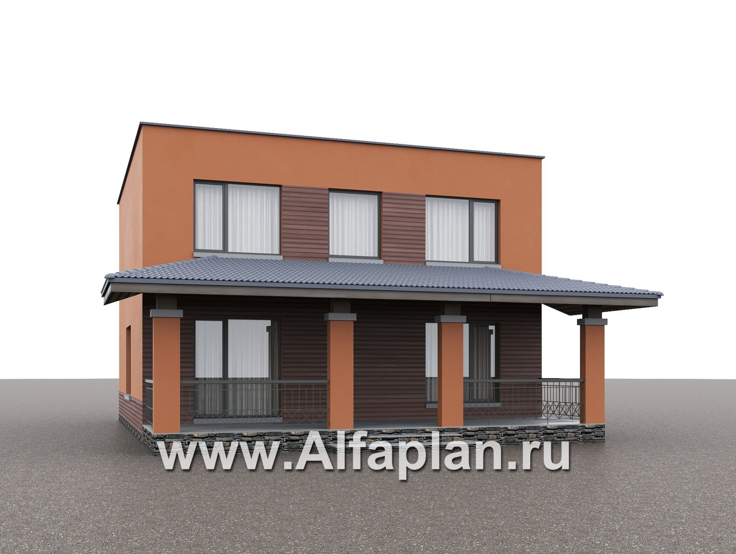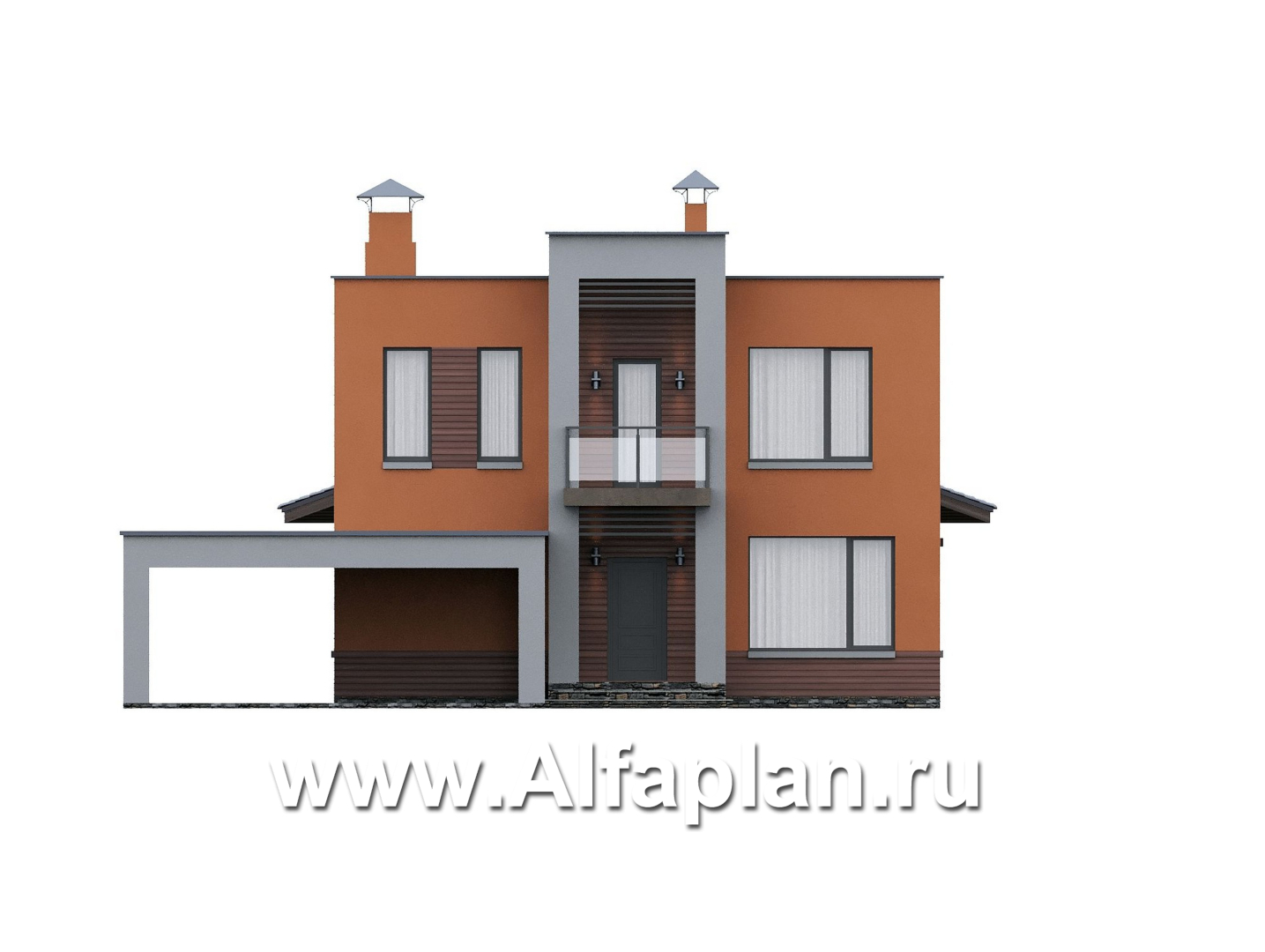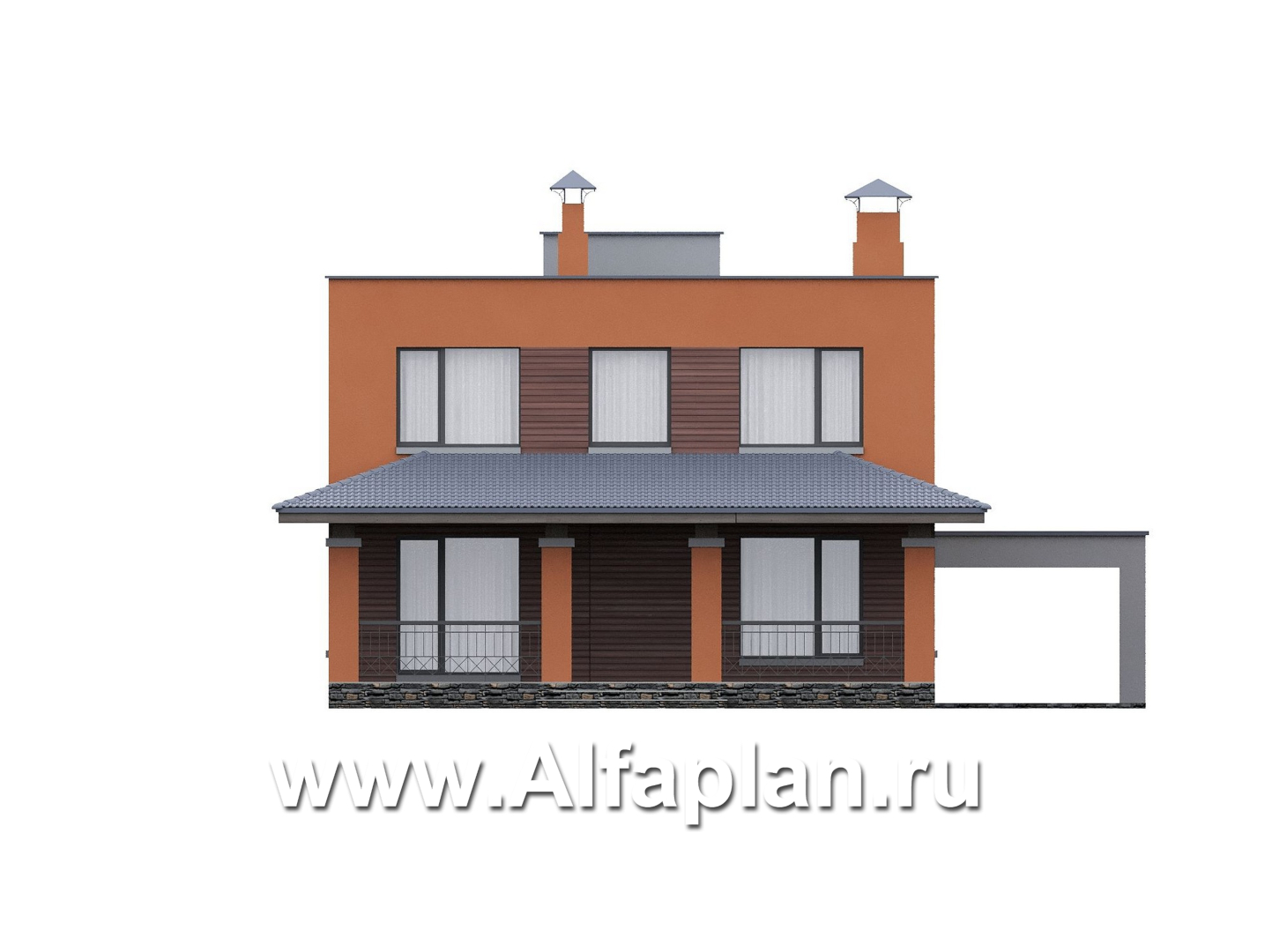 «Невада» - проект двухэтажного дома из газобетона, с террасой, навес на 2 авто, с плоской крышей в стиле минимализм