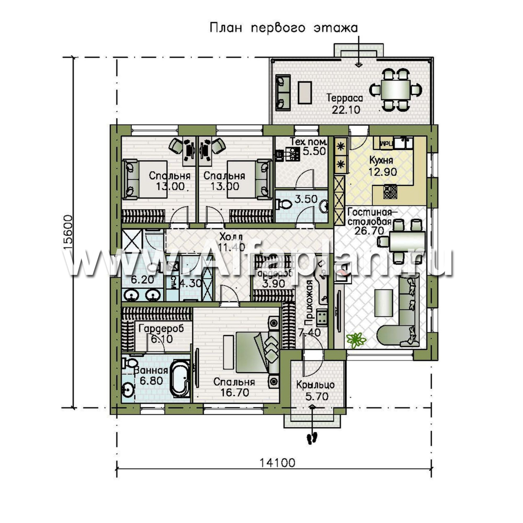 «Глория» - проект одноэтажного дома, c террасой, планировка мастер спальня, гардероб и постирочная, 3 спальни