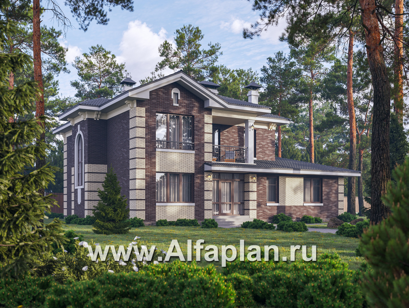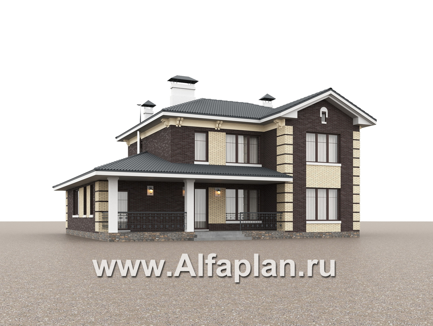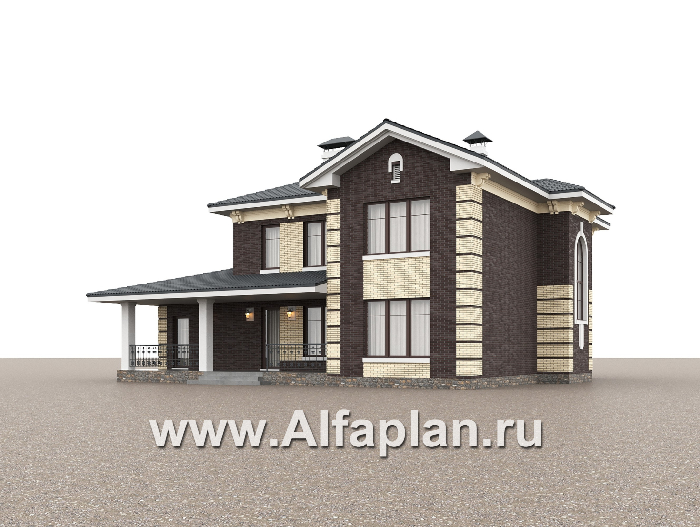 155C-S «Репутация» - красивый проект двухэтажного дома из газобетона, планировка с эркером и сауной, в английском стиле