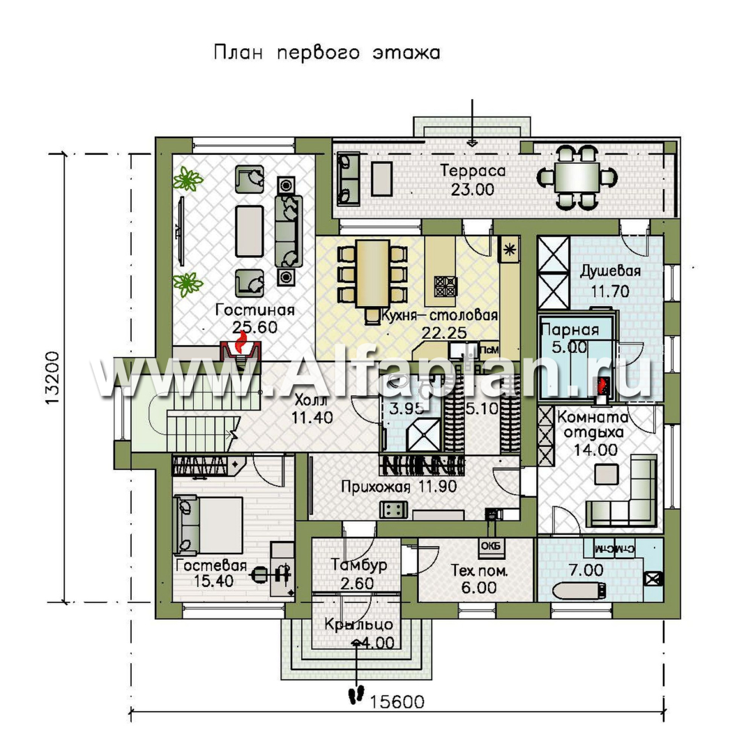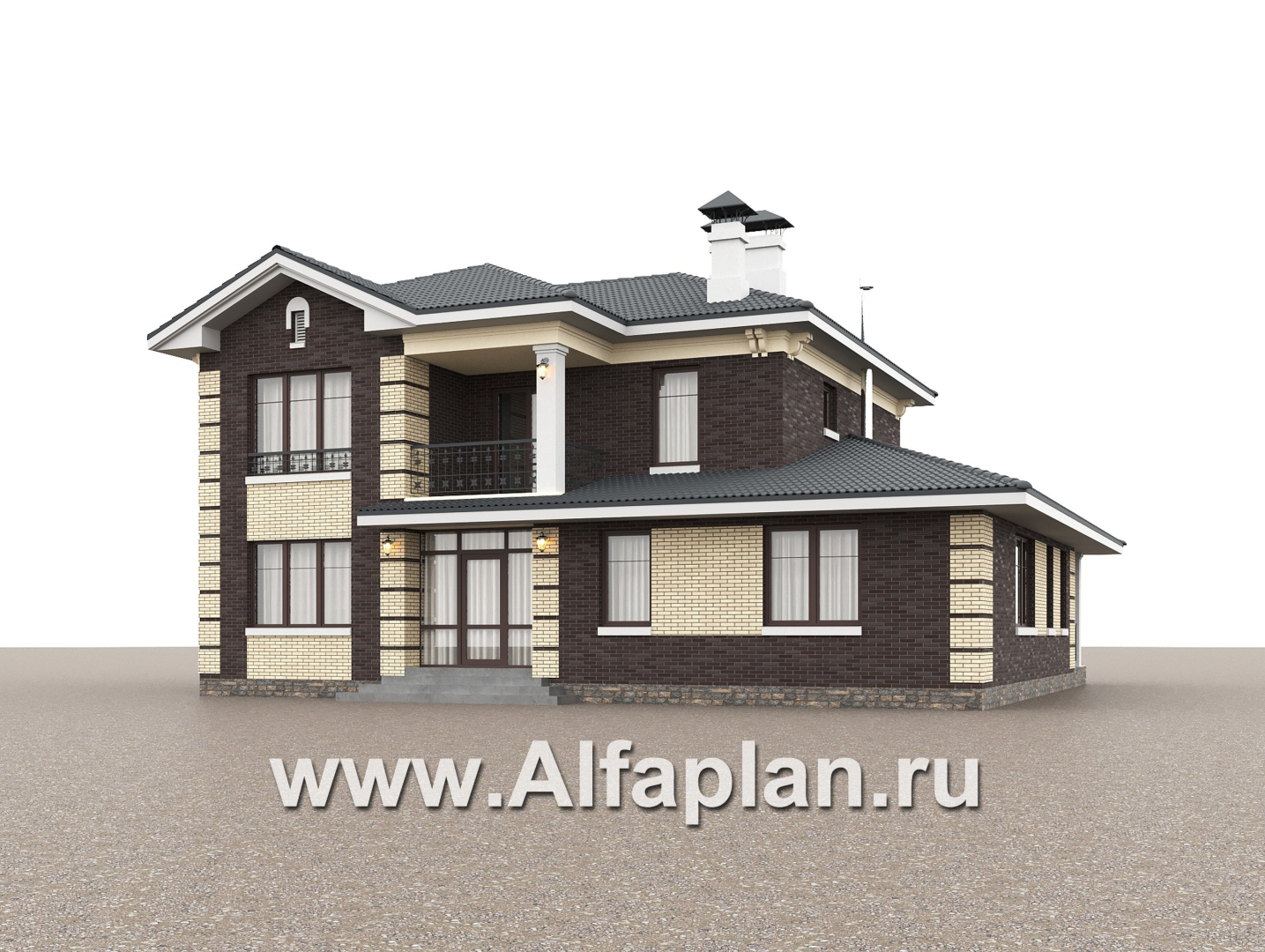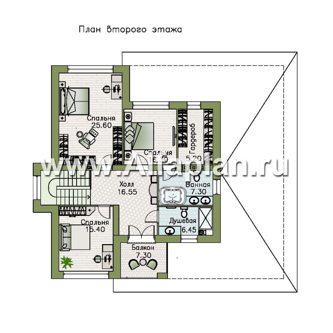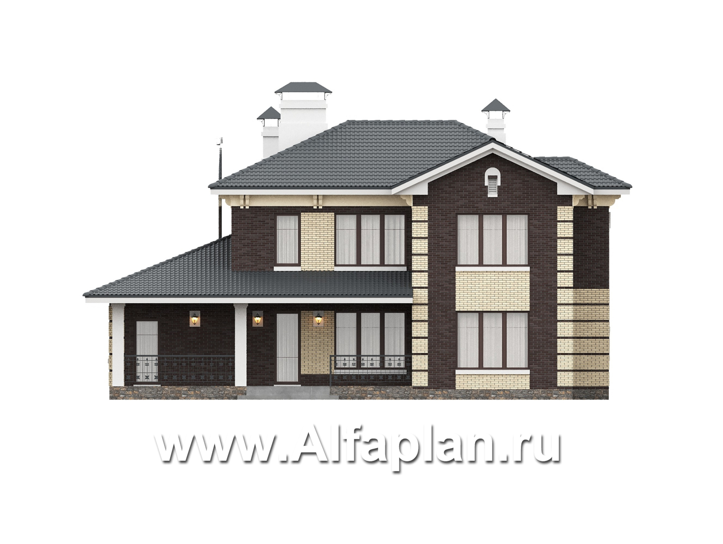 155C-S «Репутация» - красивый проект двухэтажного дома из газобетона, планировка с эркером и сауной, в английском стиле