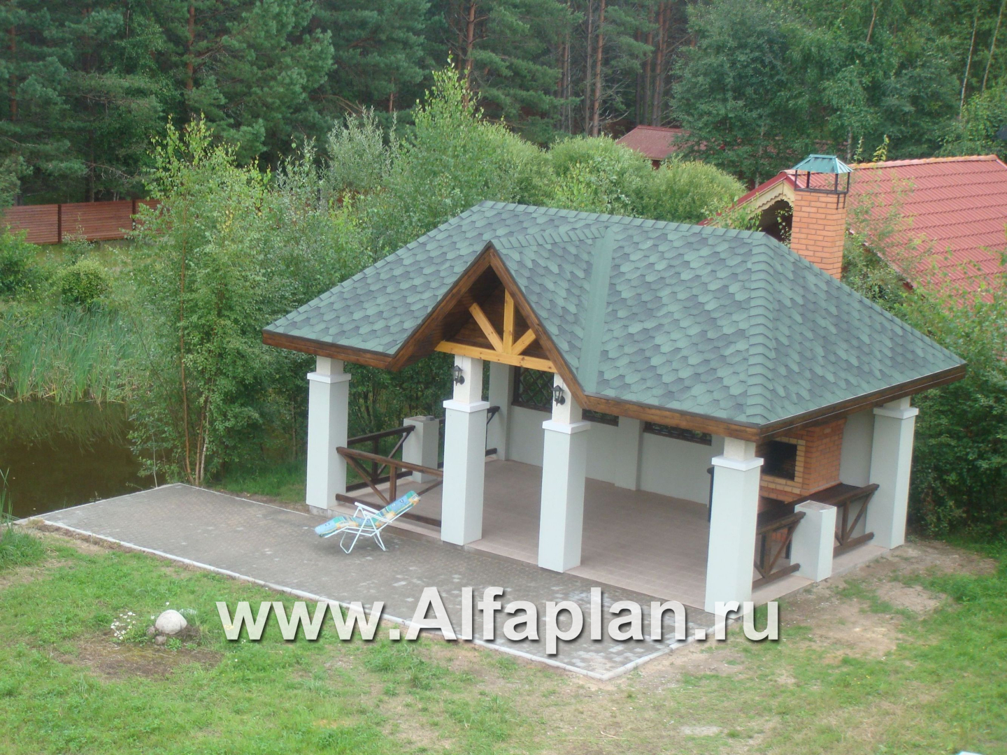Оригинальная беседка-павильон площадью 30 м² приятно порадует вас оригинальным экстерьером и продуманной геометрической формой. Сама беседка состоит из 8 колонн, кирпичного мангала, бетонной загородки с деревянным заборчиком и крыши. В качестве кровли используется битумная черепица — универсальное и хорошо зарекомендовавшее себя инженерное решение. Утеплителем выступает минеральная вата, а оконные профили выполнены из поливинилхлорида. Монолитная железобетонная плита, которая выступает в качестве фундамента беседки, гарантирует долгий срок эксплуатации конструкции на протяжении многих десятилетий.