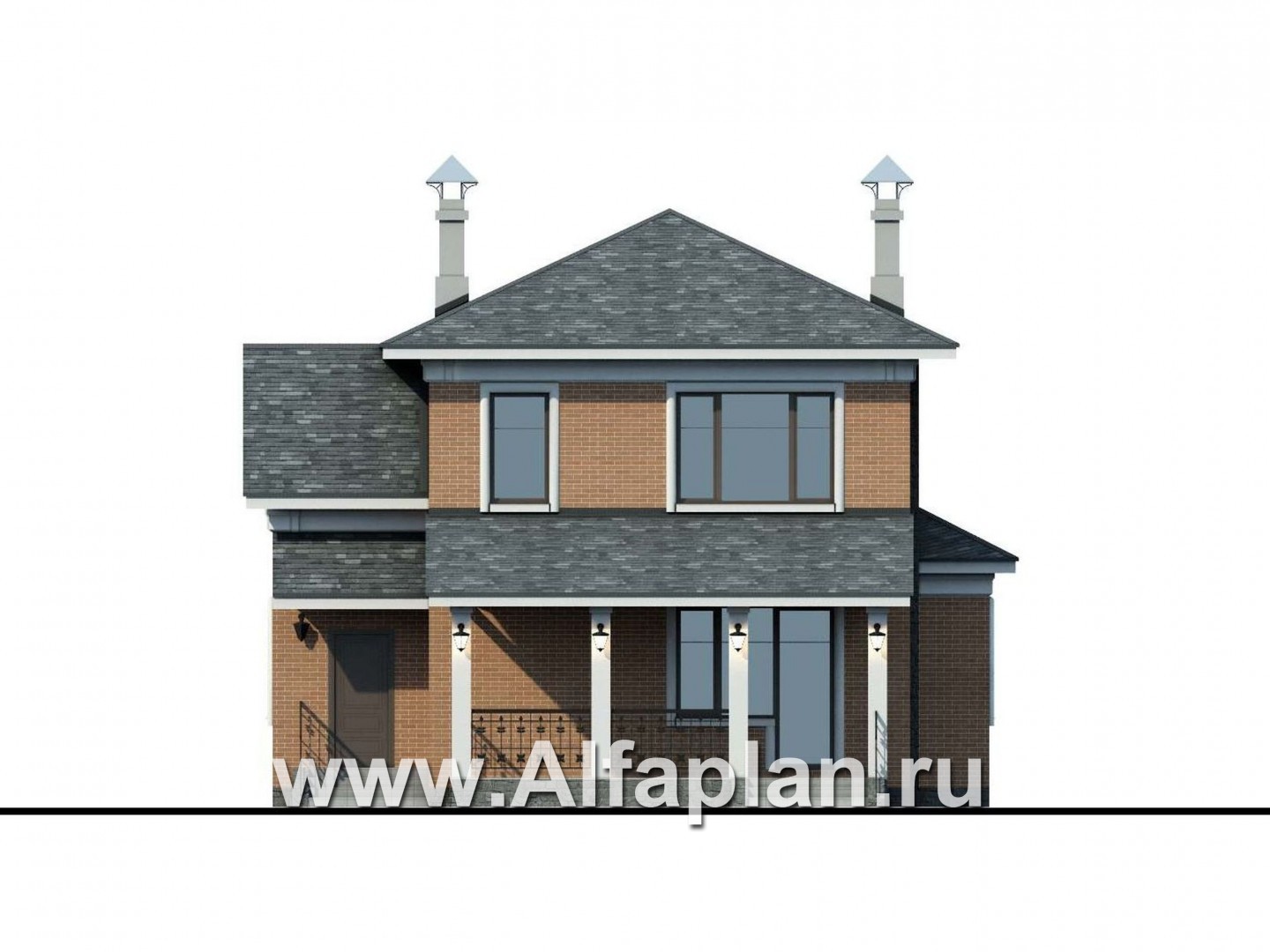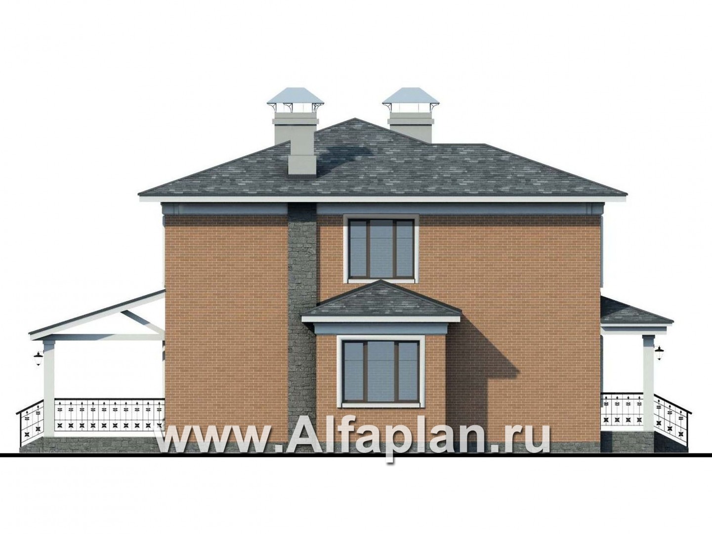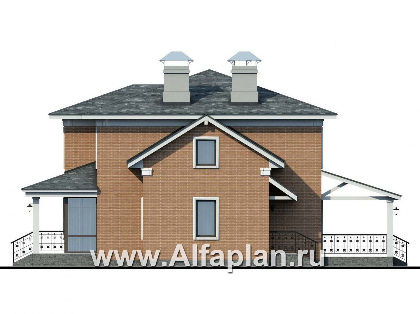 Разумеется, в случае с этим кирпичным (газобетонным) домом говорить о слепом следовании классическим традициям не приходится, и главное, что напоминает об этом, – главенствующий здесь принцип асимметричности. В частности, это касается расположения эркеров и главного входа, а также форм и размеров окон.