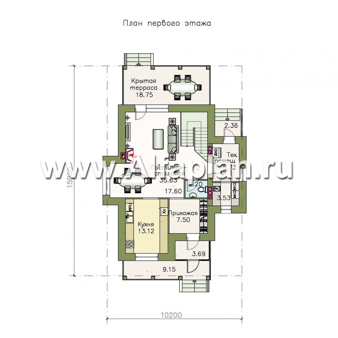 Гостиная сообщается с крытой террасой, которую в теплое время года предполагается использовать в качестве столовой. С террасы можно попасть во двор, кроме того, здесь же предусмотрен еще один вход в служебный блок, расположенный в боковом эркере.