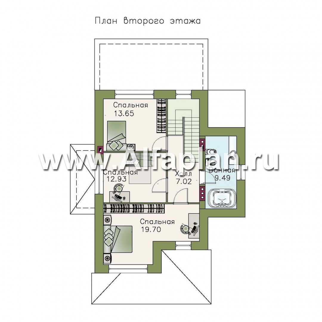 Проект дома из газобетона (кирпича) предусматривает наличие трех спален, расположенных на втором этаже. Помещения приватной зоны, являющиеся смежными, сгруппированы вокруг холла.