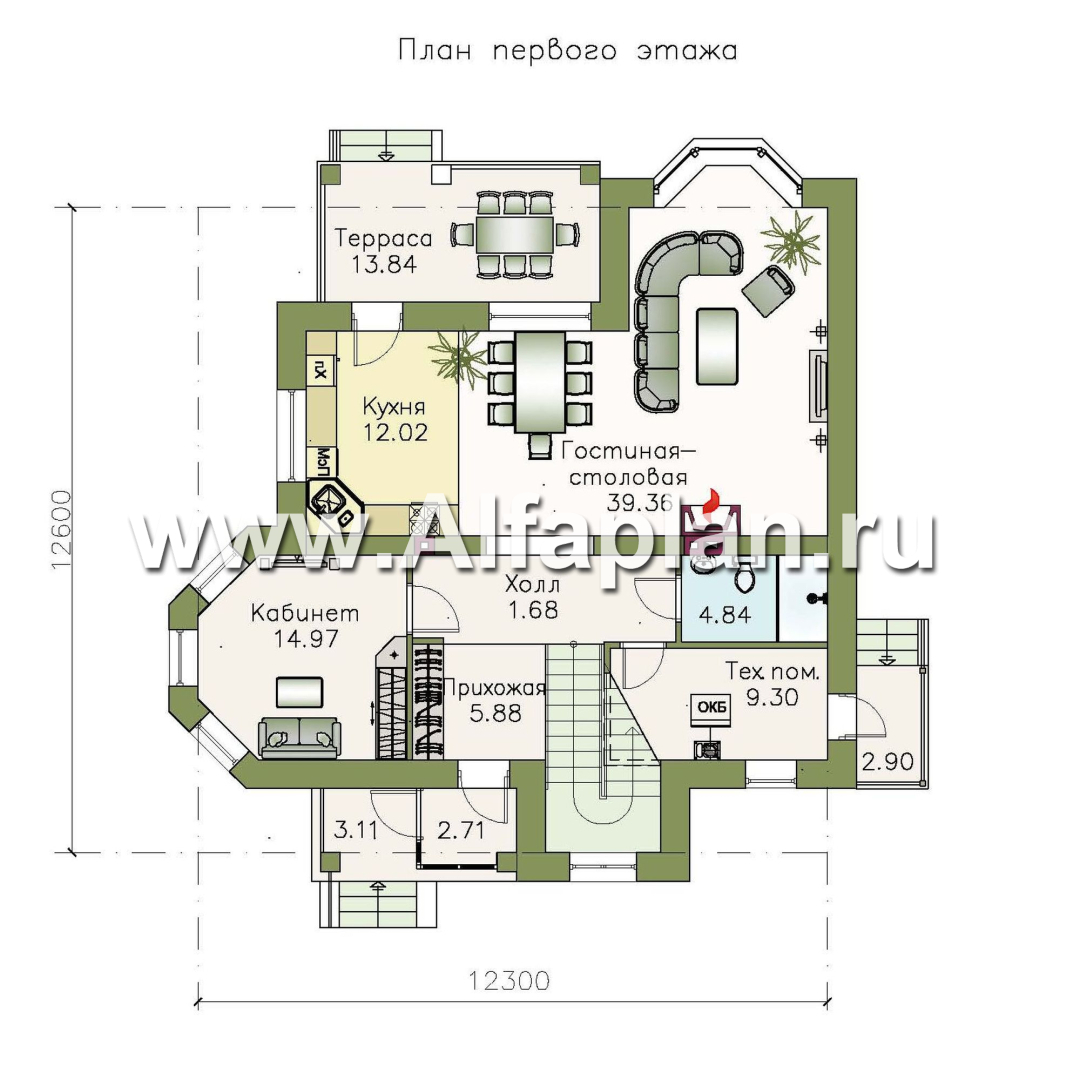 На входе в дом – просторная прихожая с лестницей на второй этаж. Из прихожей предусмотрен выход в котельную. Гостиная, столовая и кухня – единое помещение. Расположение камина выбрано таким образом, чтобы он был виден с дивана гостиной, и от обеденного стола. Из кухни-столовой можно напрямую выйти на крытую террасу. На первом этаже также предусмотрен кабинет (альтернативно, гостевая комната).