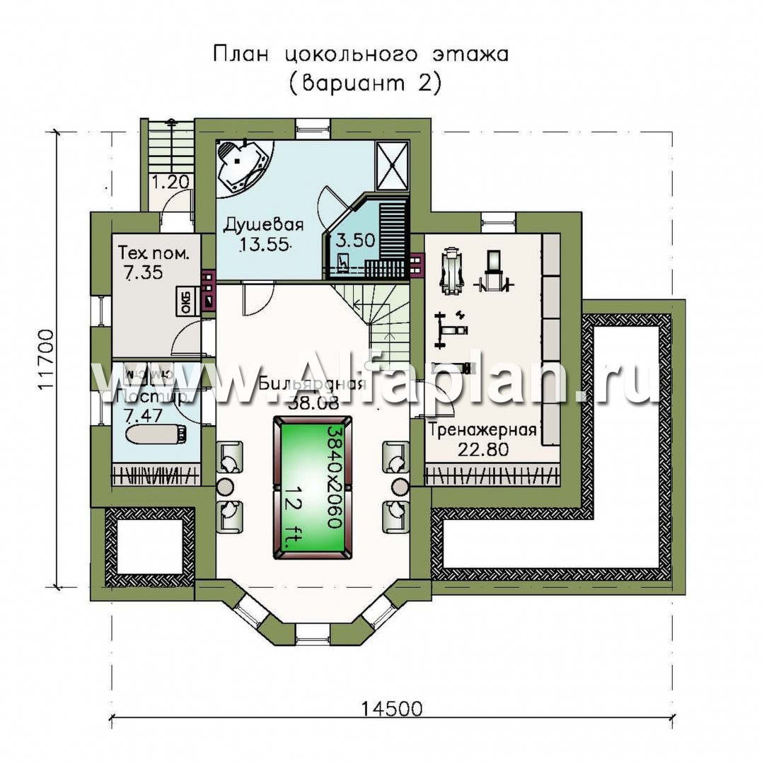 На цокольном этаже инженеры предусмотрели бильярдную, душевую, прачечную, тренажерный зал и техническое помещение. Заказчик может на своё усмотрение распределить функциональные зоны.