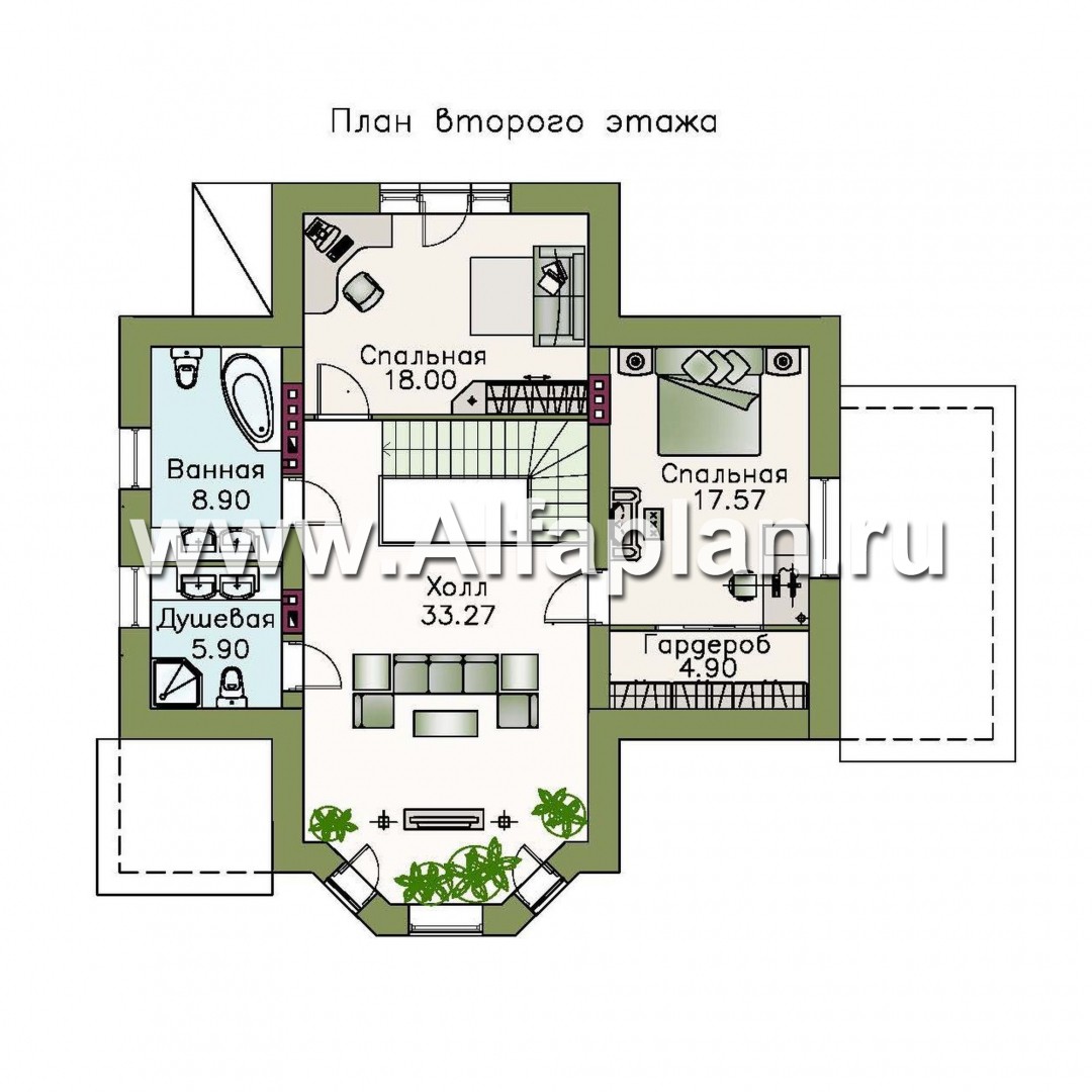 На второй этаж нас ведет угловая лестница, и мы оказываемся в большом холле площадью 33 м2. Отсюда двери ведут в одну из двух спален, в ванную и в душевую. В обеих спальнях предусмотрен гардероб.