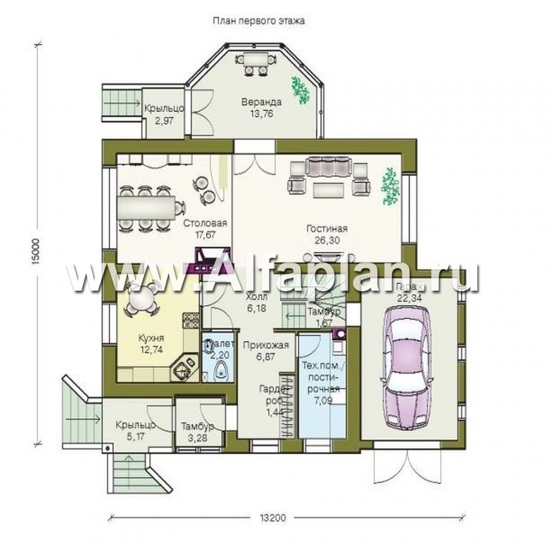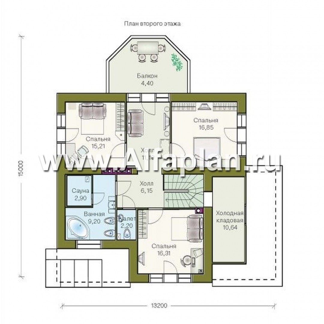 Продуманный подход позволил на двух этажах этого дома с относительно небольшой площадью разместить все помещения для комфортной жизни семьи. На первом этаже - это помещения для коммуникации семьи и гостей. Целый пролет отдан гостиной и столовой, они являются единым пространством. Камин расположен так, что создает уют и в гостиной, и в столовой. Отсюда можно выйти на веранду, спуститься в сад, а можно и саму веранду превратить в небольшой зимний сад. С кухней столовая соединяется через арочный проем. В холле, рядом с входом расположено техническое помещение, совмещенное с прачечной. Дополняет планировку первого этажа гараж, удобно связанный с жилой частью дома. Второй, мансардный этаж - место отдыха семьи. Вокруг уютного холла группируются три спальни и ванная комната. Здесь также предусмотрены холодная кладовая и санузел. Площадь ванной позволяет оборудовать небольшую сауну. Размещение сауны в спальной зоне придает последней дополнительный комфорт. Это же относится и к большому, красивому балкону. Удобная, логичная планировка в этом проекте гармонично сочетается с выразительным силуэтом и тщательно прорисованными фасадами.