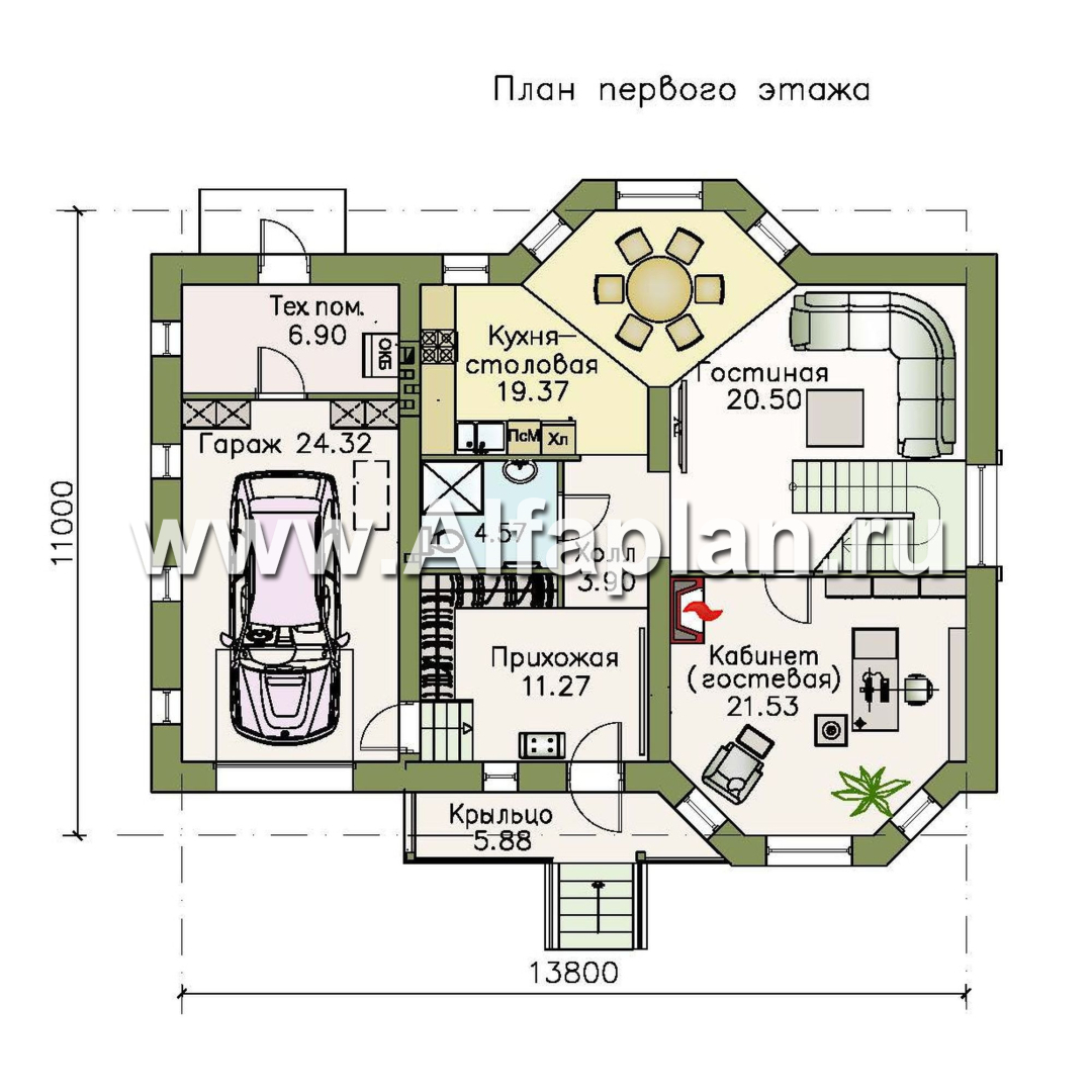 Камин вместе с дымоходом Вы сможете передвинуть в гостиную, сделать это можно по месту без корректировки проекта. Назначение жилой комнаты на первом этаже может быть любым по вашему желанию: гостевая, спальня, кабинет.
