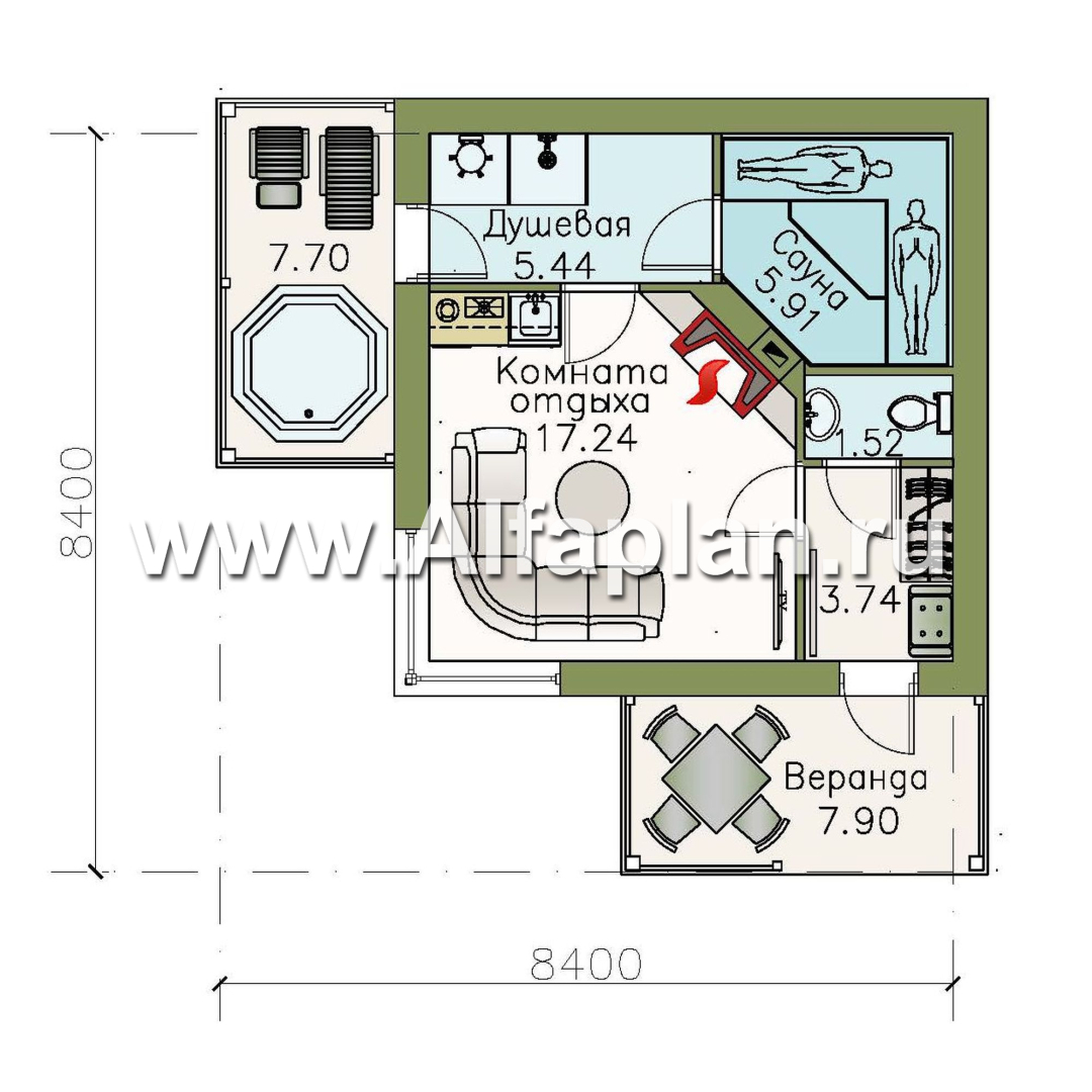 толщина плиты фундамента - 250 мм, высота потолка в нижней точке (помещение парной) - 2400, высота потолка в верхней точке (комната отдыха) - 3500. Инженерные разделы в проектах малых архитектурных форм не предусмотрены, разрабатываются по месту силами строителей. Высота здания в верхней точке - 4650.