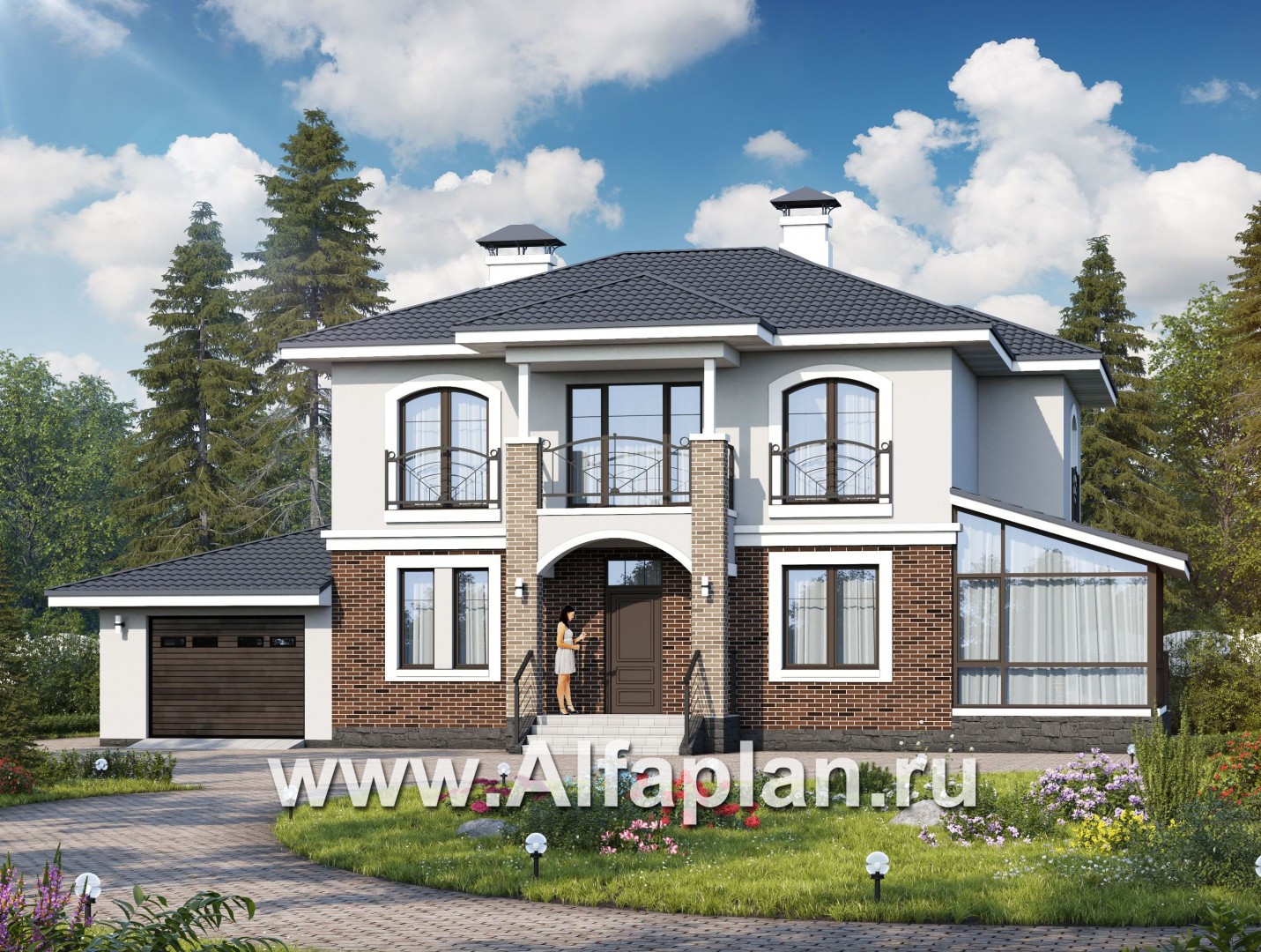 «Соблазн» - проект двухэтажного дома из газобетона, с остекленной верандой, гараж на 1 авто