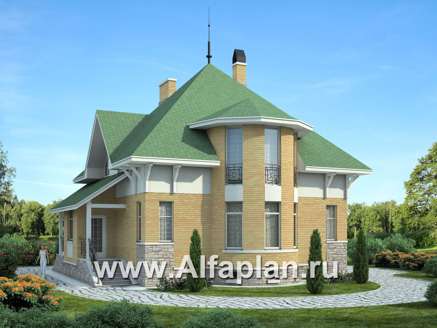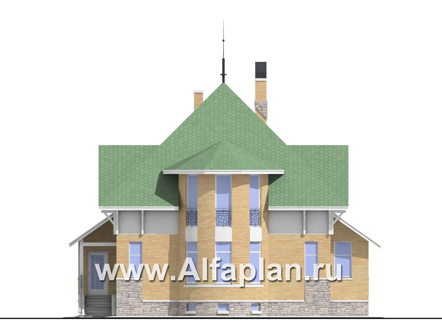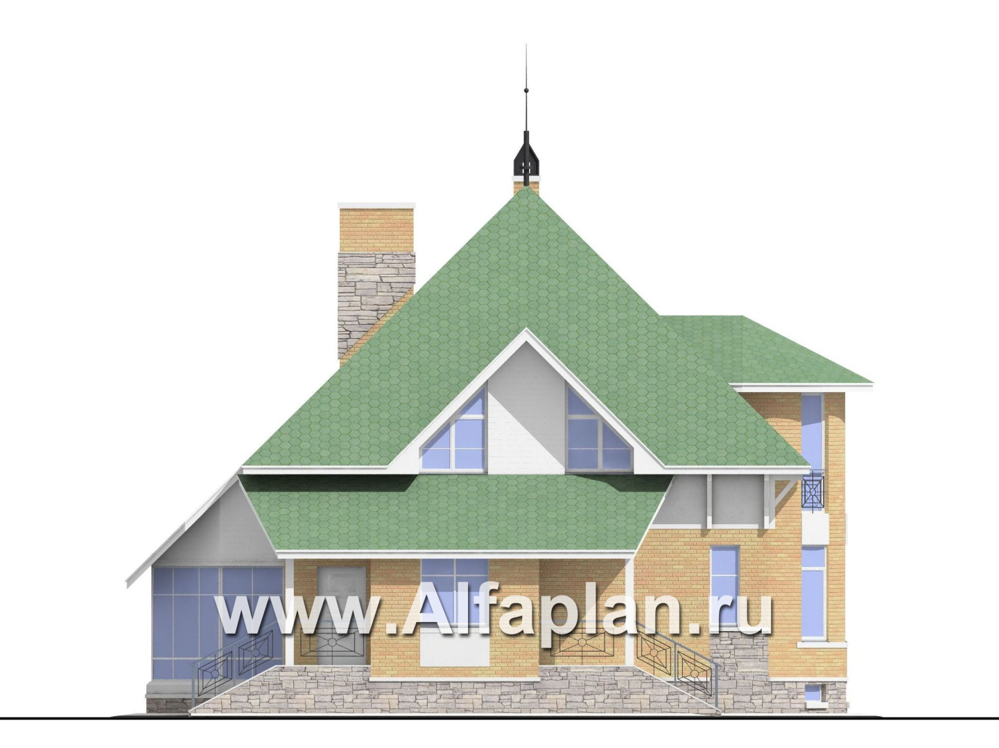 Дизайн экстерьера выполнен в светлых тонах. Пастельно- зеленая крыша прекрасно гармонирует со светло-желтым облицовочным кирпичом. Довершают этот образ белая декоративная штукатурка и светло-серый искусственный камень. Композиция, в итоге, очень легкая, почти воздушная.