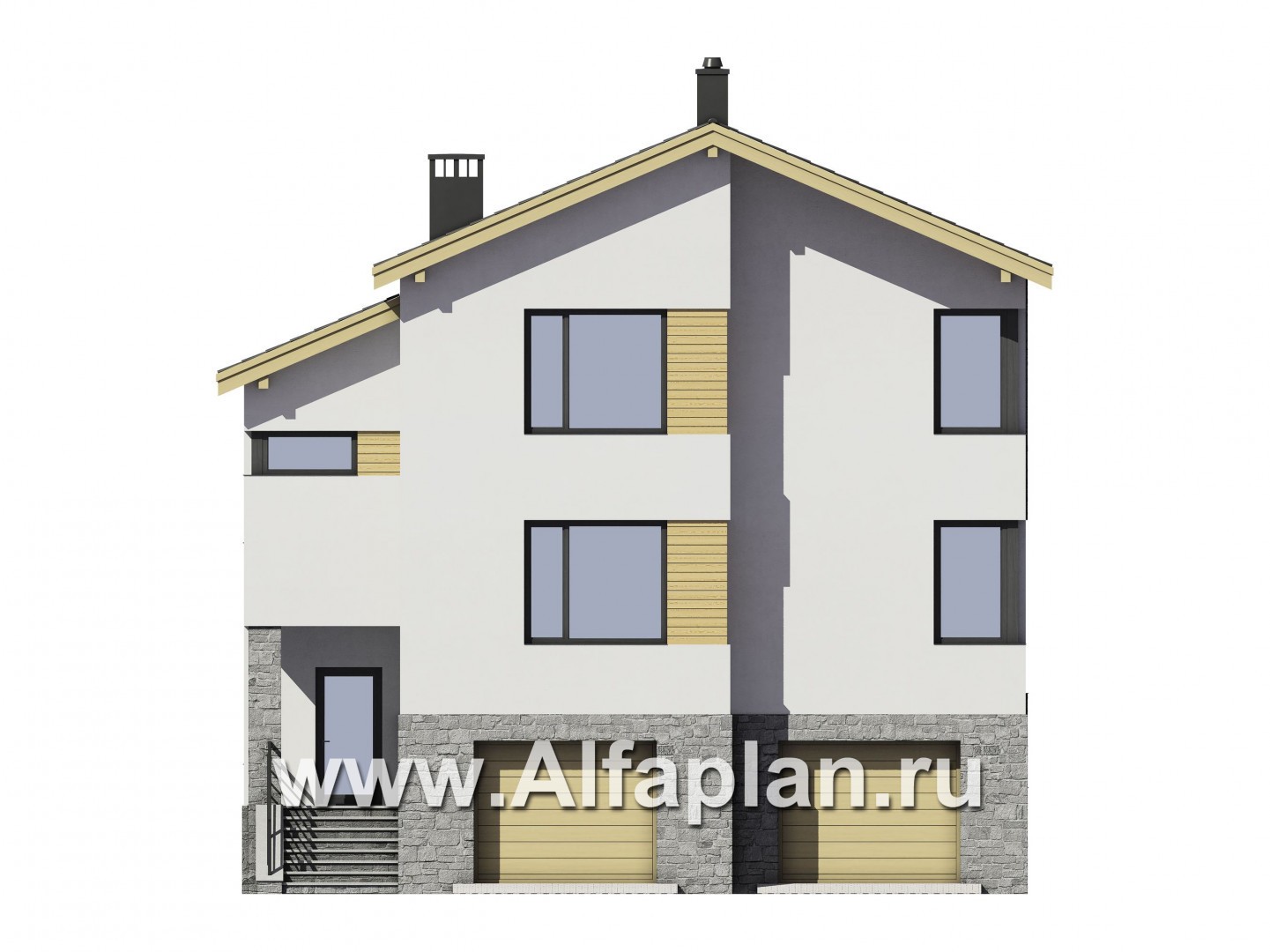 Проект трехэтажного дома, с гаражом на 2 авто и с сауной в цоколе на уровне земли, в современном стиле