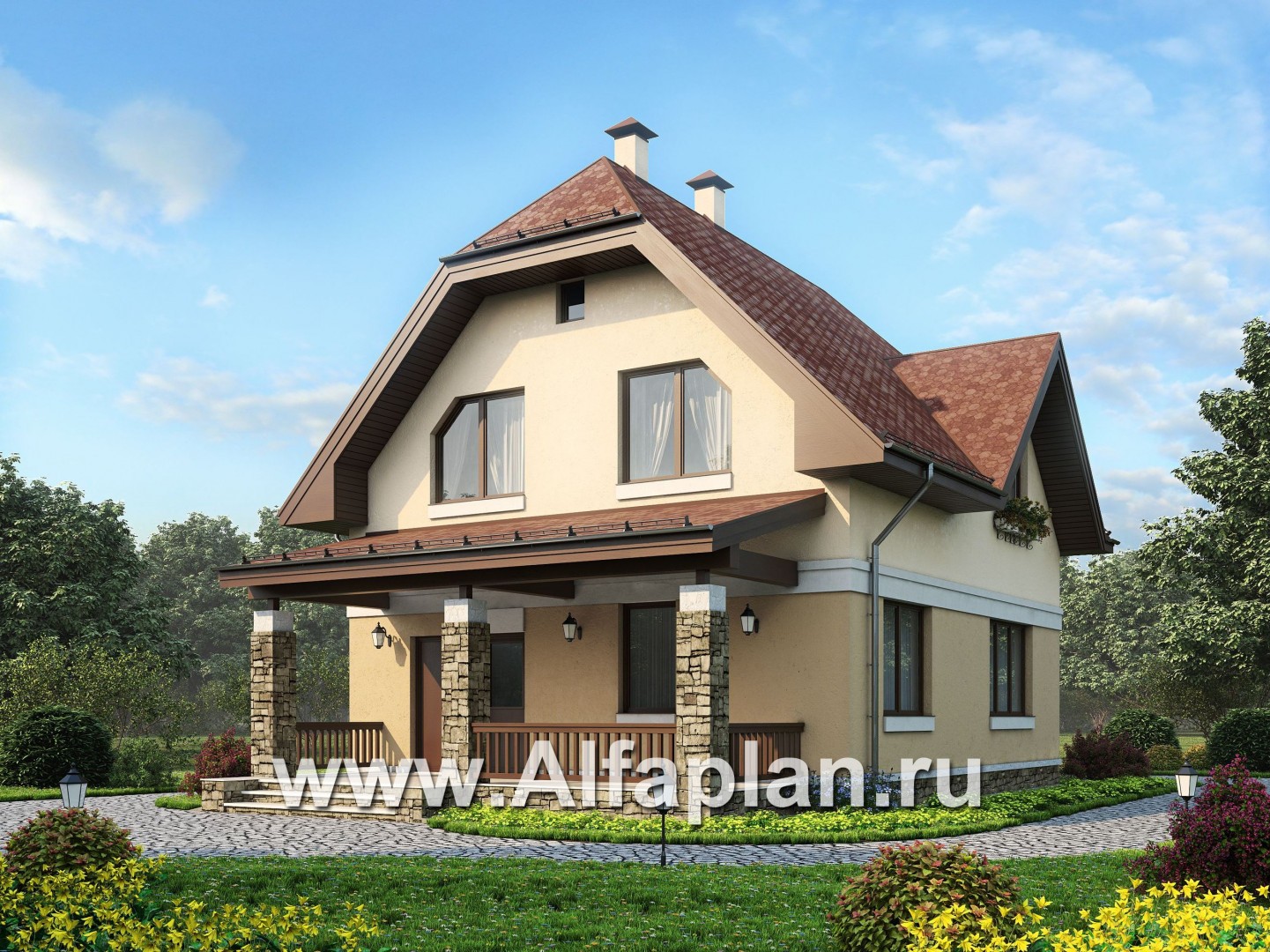 Проект дома с мансардой, планировка с террасой со стороны входа и кабинетом на 1 эт