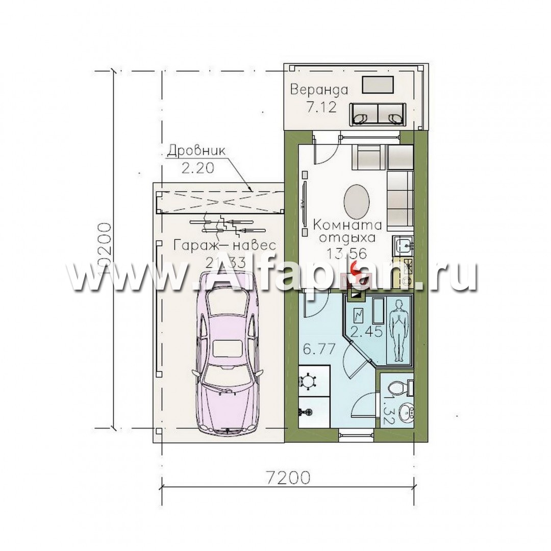 Чтобы попасть в дом, нужно обойти гараж. Комната с камином и кухней подходит для летнего отдыха, а при желании ее можно оборудовать для постоянного проживания. Дверь объединена с большим окном, поэтому здесь всегда будет достаточно солнечного света. Площадь помещения – 14 м2.